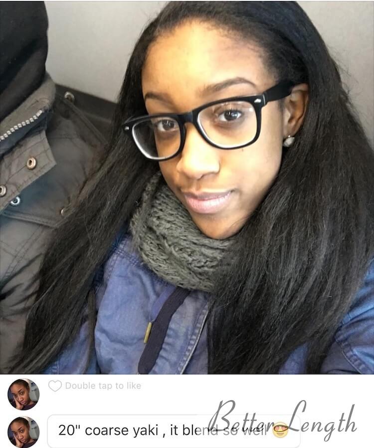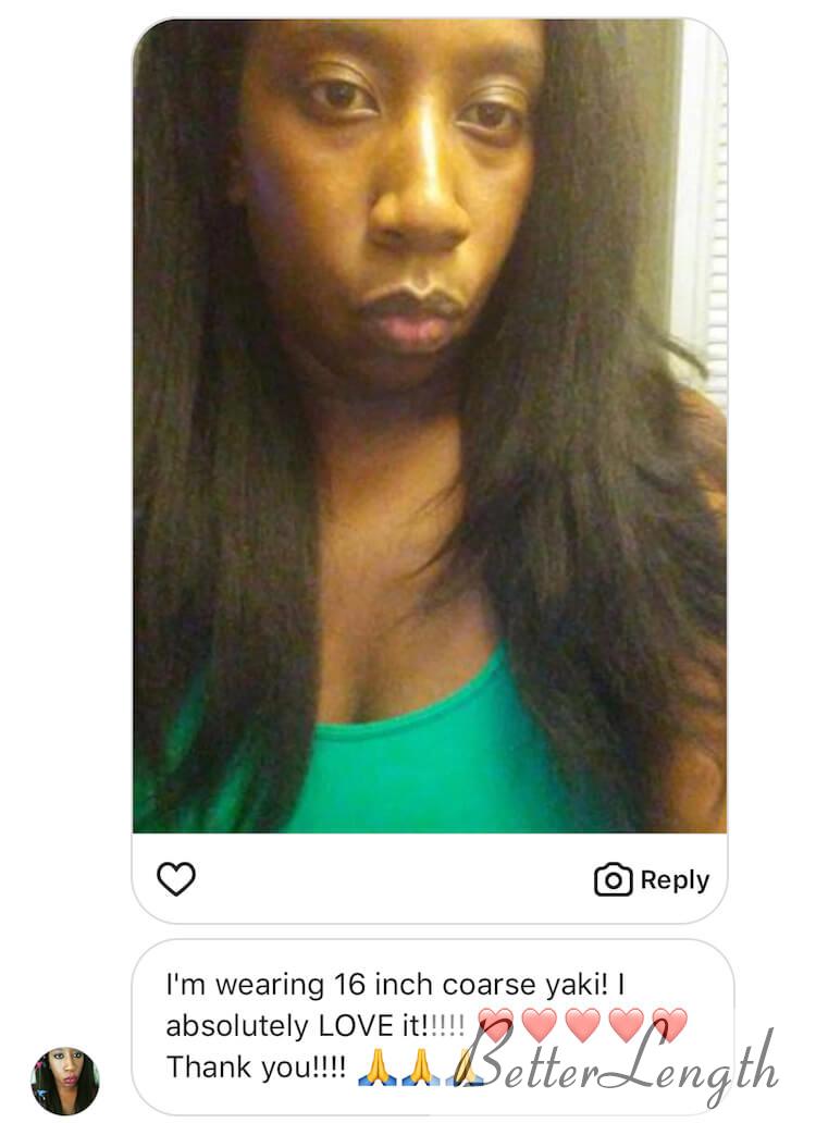 I'm wearing 16 inch coarse yaki! I absolutely LOVE it!!!❤️❤️❤️ Thank you!!!!🙏🏽🙏🏽🙏🏽